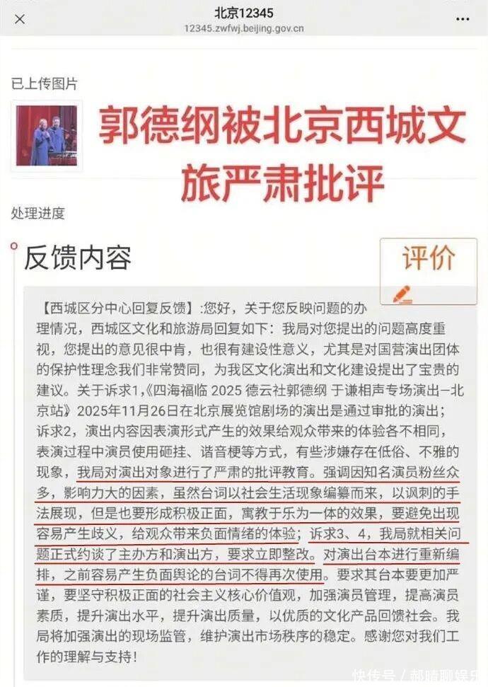 针对德云社的举报,日提交的,官方那日给予的回应。官方回馈后,相关截图就被晒出了。12日,在网络形成了关注。针对举报者的四个诉求,官方也给予了反馈,约谈了德云社,对当事演员进行了批评教育。可以说,态度是坚决的,处罚是有依据的,有力度的。德云社这边,也是有针对性改变的。昨晚,郭德纲在无锡,岳云鹏在澳门,孟鹤堂在杭州,张鹤伦在南京。演出时,都很注意,也很好地保证了演出效果。